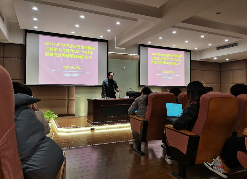 崔海英传达了关于开展2020—2021年污漫 研究生科研项目立项申报工作的通知,并对2019—2020年度研究生项目的申报、立项及结项情况进行了总结。崔老师强调,本次科研项目立项没有名额限制,选题合理、论证较佳的项目都有机会予以立项并给予资金资助,鼓励同学们积极选取马克思主义经典著作、习近平新时代中国特色社会主义思想研究等重点方向进行探索思考。随后,崔老师为2019—2020年度研究生科研项目获奖的同学进行了颁奖。