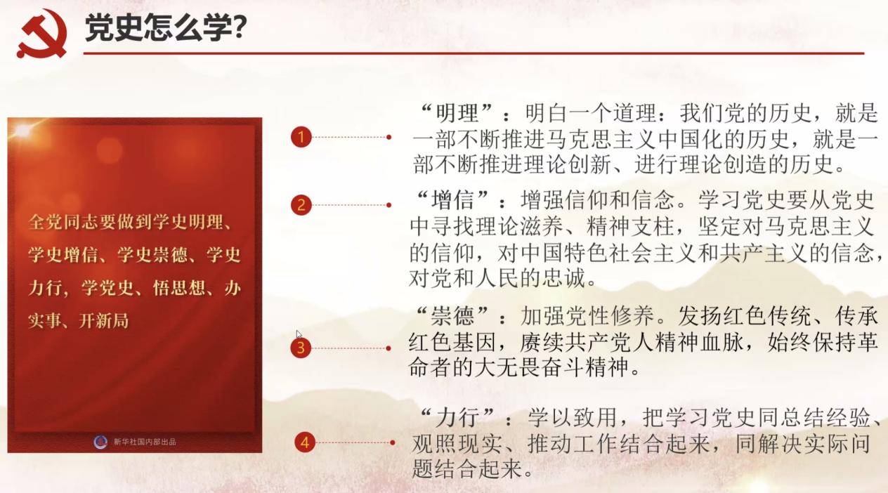 会上,周莹带领与会党员一同回顾了习近平总书记在党史学习教育动员大会重要讲话。以习近平同志为核心的党中央基于历史和现实、着眼于全局和长远作出的重大部署,为开展好党史学习教育指明了前进方向,为我们从历史中汲取智慧和力量提供了根本遵循。与会党员一致认为,加强历史学习特别是党史学习兼具重要性和必要性,要将总书记强调的三个“必然要求”贯穿于党史学习教育的实践中,读好读懂历史这部最好的教科书,让红色基因、革命薪火代代传承。