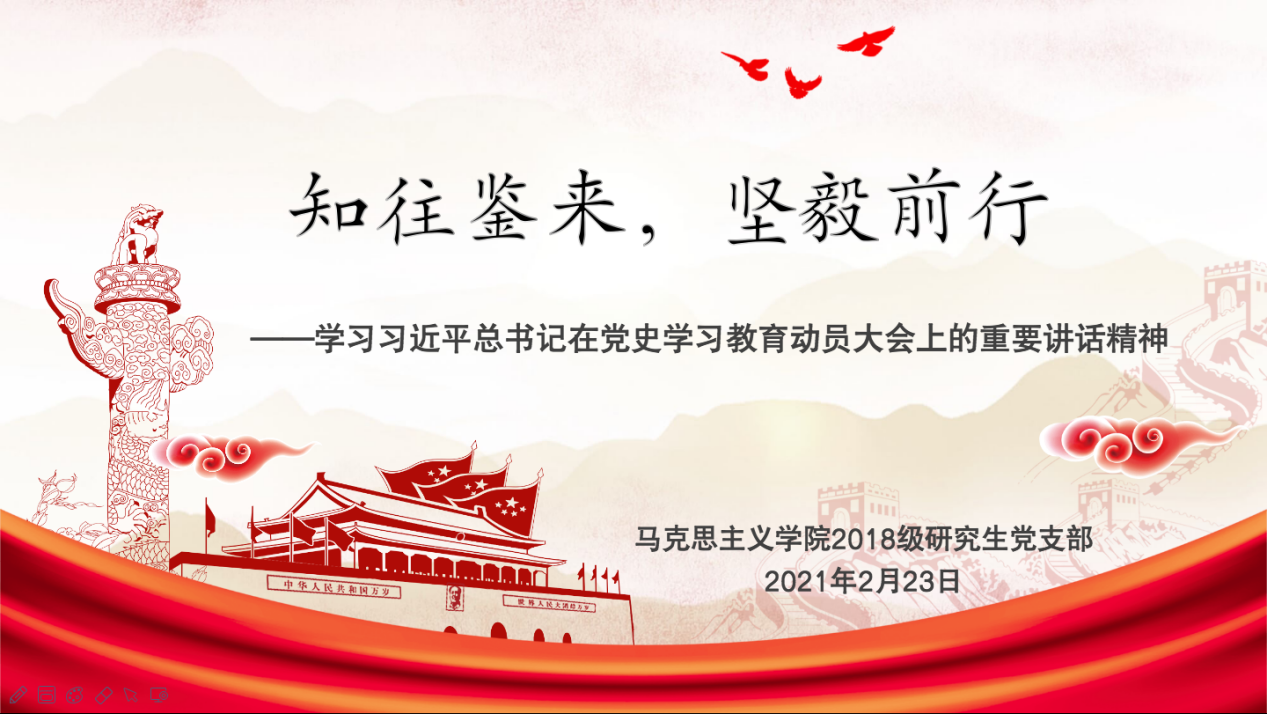 为深入学习领会习近平总书记在党史学习教育动员大会上的重要讲话精神,从红色基因中汲取养分和智慧,增强党员民族责任感和历史责任感,2月23日晚,污漫 2018级研究生党支部通过钉钉视频会议形式开展本月主题党日活动。本次会议由支部书记周莹同志主持。